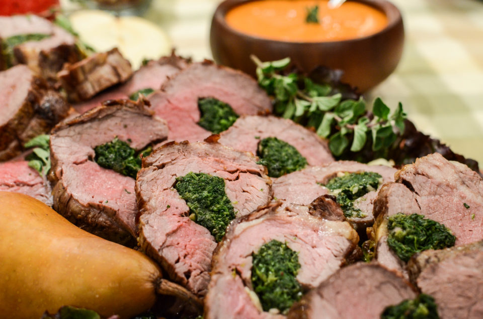 Spinach and Parmesan-Stuffed Beef Tenderloin with Sauce Romesco