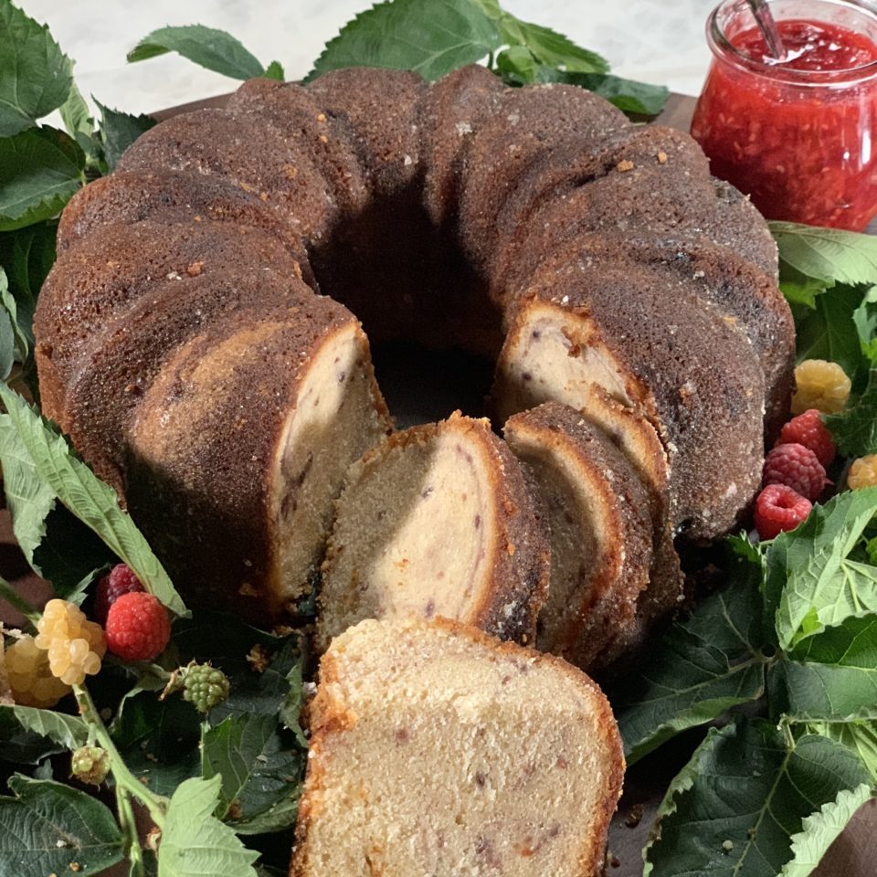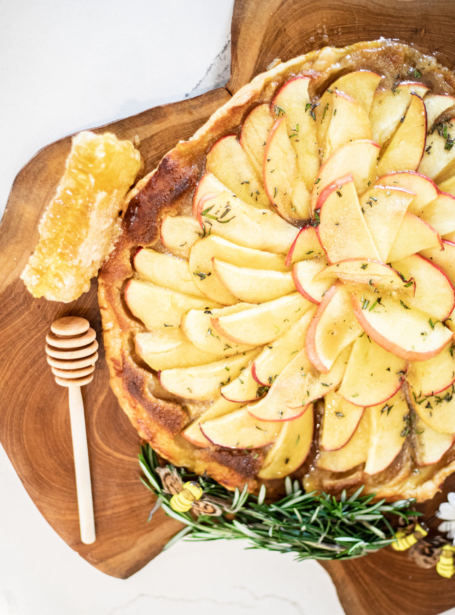 - Place the rosemary and remaining 1/3 cup (80ml) honey in a pan over low heat, swirling to melt honey, then pour over tart.
