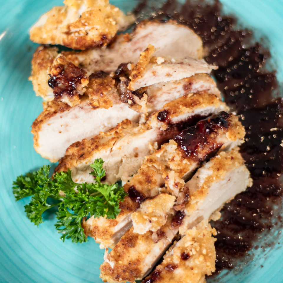 - While meat is cooking, add blueberry sauce ingredients to a small saucepan and bring to a boil. Reduce to simmer and continue to cook until ¾ of liquid is gone, be sure to stir periodically. Top cooked pork chops with blueberry sauce.
