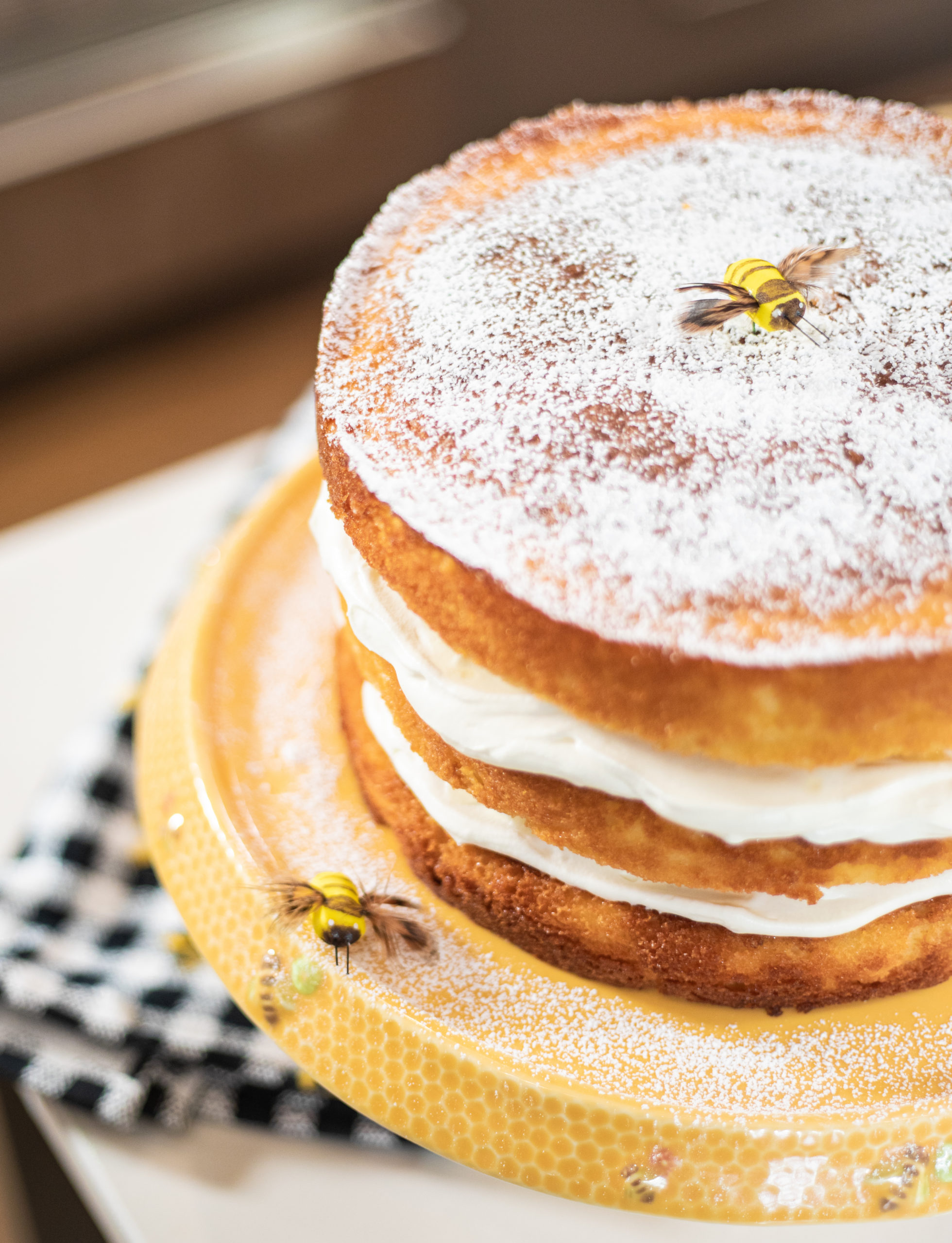 - Place one sponge cake on a serving plate. Spoon over half the cream and spread out to the edges. Scatter with half the honeycomb. Top with second sponge cake and remaining cream, spreading to edges, then scatter with remaining honeycomb. Top with final sponge cake.