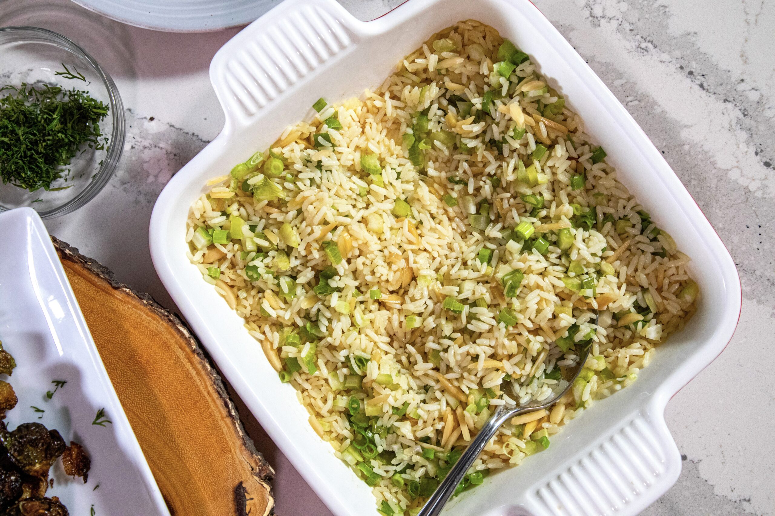 - Remove from the oven and stir in the celery, green onions, and almonds. Return to the oven and bake, covered, for another 30 minutes.
