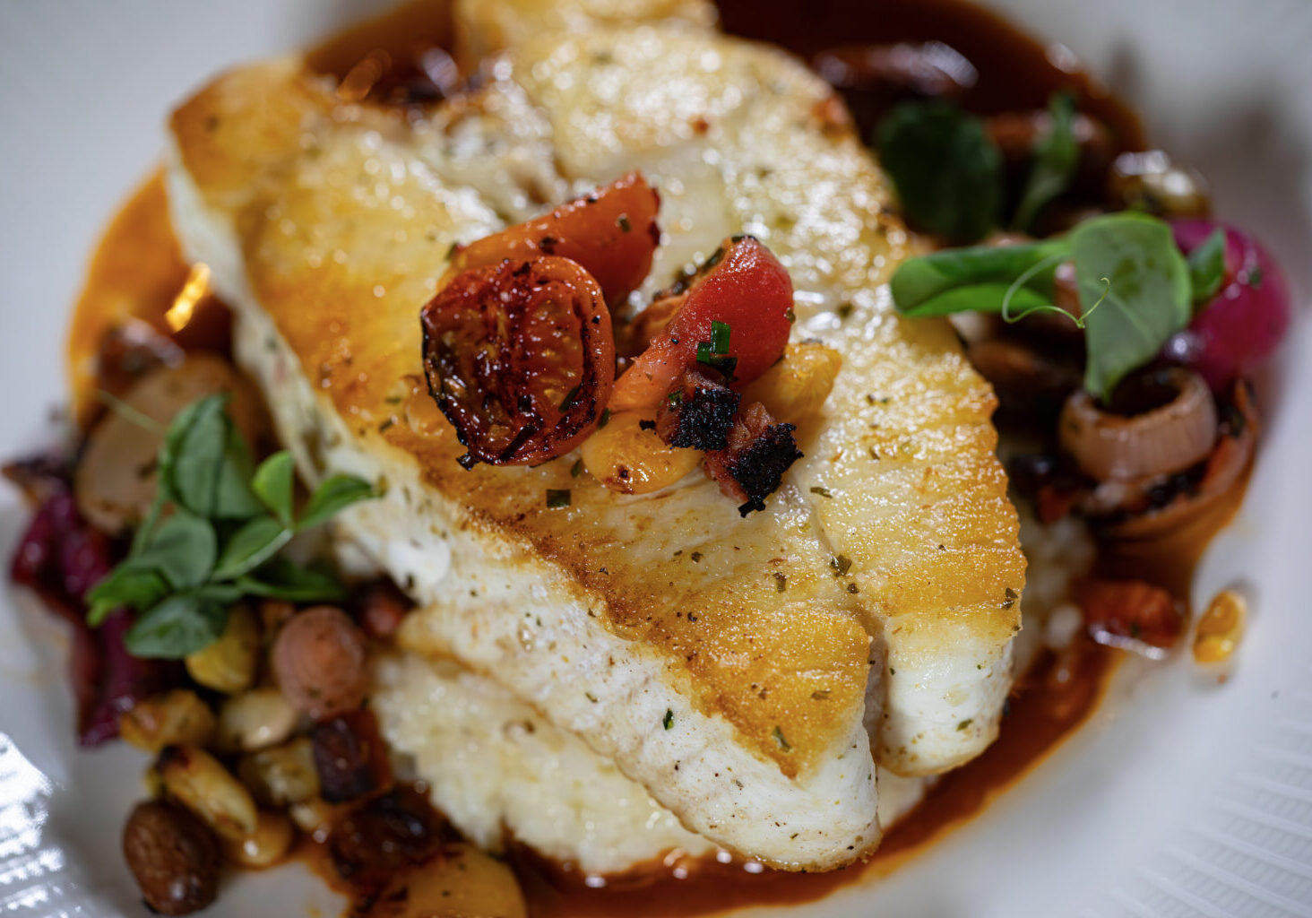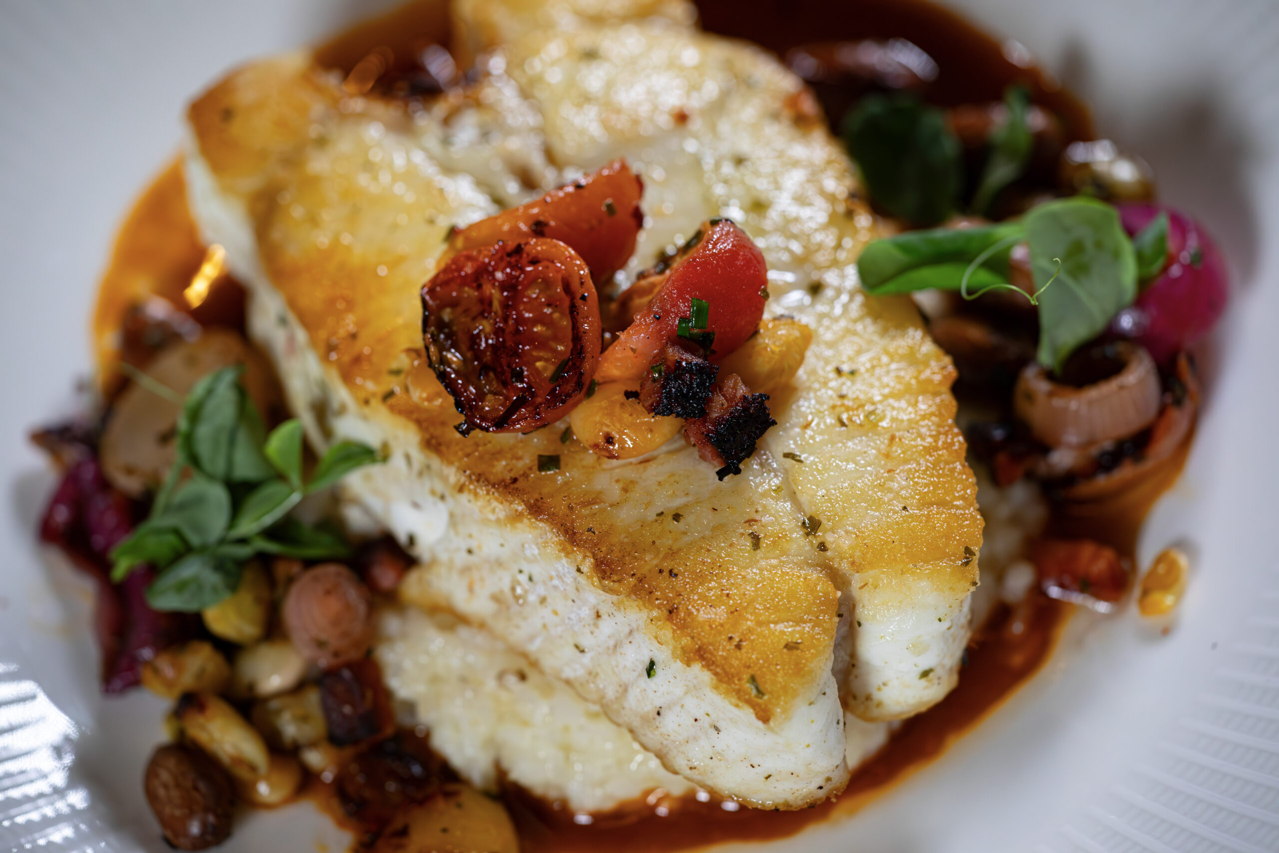 - To serve, place the halibut on top of rice grits, or side of choice, and spoon the vegetables over the top. Drizzle the shrimp jus over top and around the halibut.