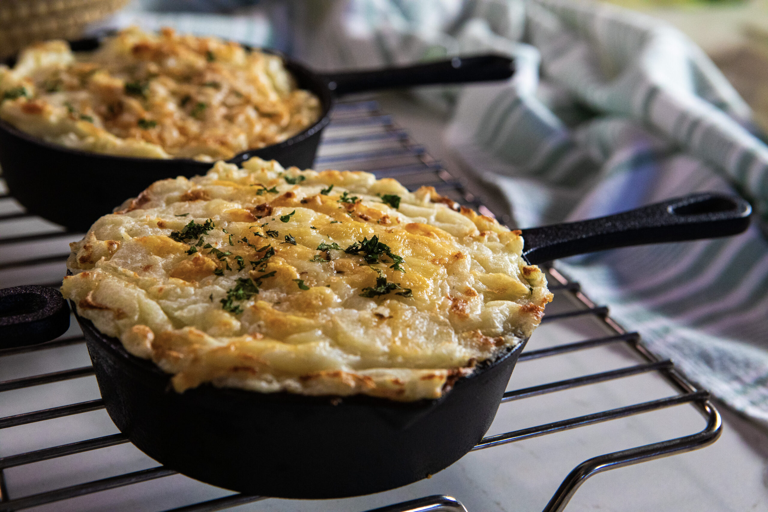 - Mash the potatoes and beat in the butter, cheese, cream, truffle oil, salt, pepper, and cheese.